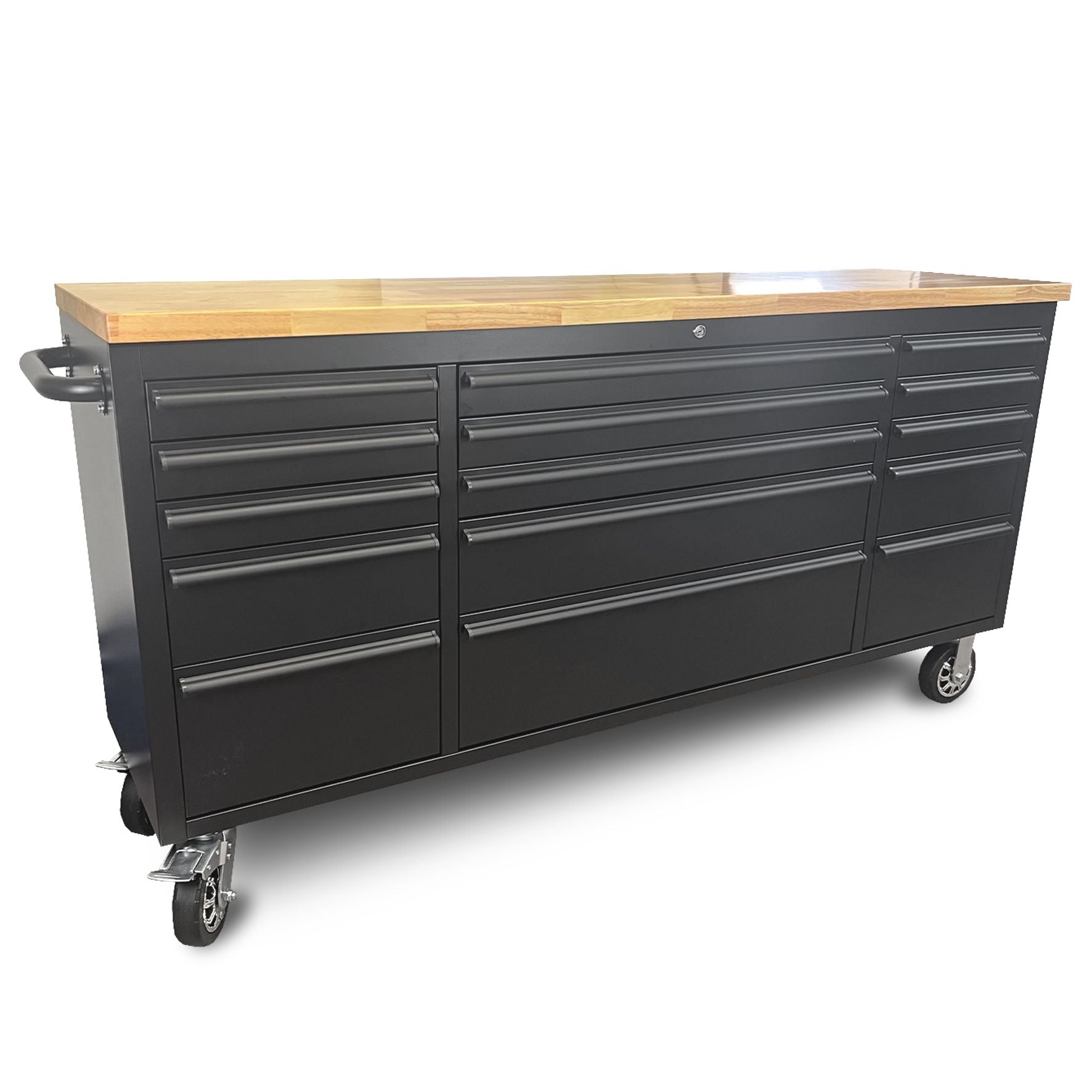 72" Matte Black Powder Coated Steel 15 Drawer Lockable Wooden Top Tool Chest
