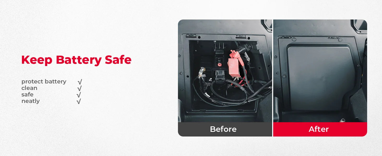 This battery cover serves as a protective shield, safeguarding the original car battery from dust, mud, and other debris. Its purpose extends to facilitating easy cleaning of the battery area.