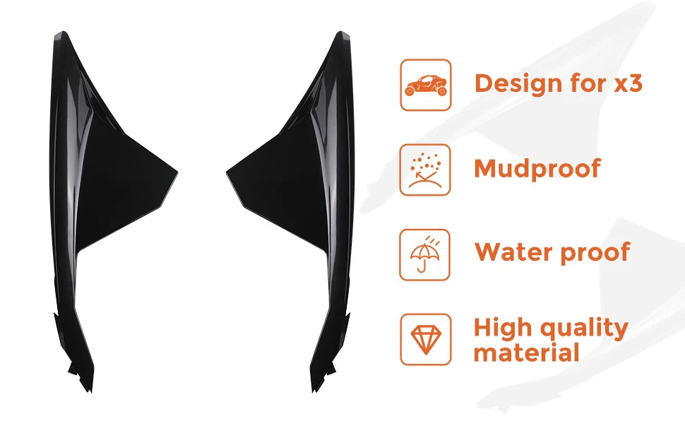 Black front fenders provide clearance and protection for your SXS, protect your Maverick X3 from mud, stones, brush, and other trail hazards getting inside the engine area.