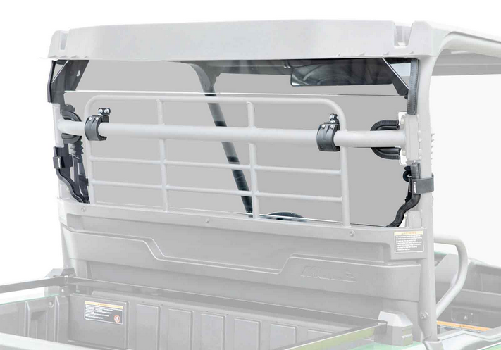 This rear windscreen for the Kawasaki Mule Pro MX series provides excellent protection against the elements while enhancing ride comfort by eliminating suction caused by a standalone front windshield. Made from 1/4" lightly tinted polycarbonate, it offers exceptional durability, being 250 times stronger than glass and 25 times stronger than acrylic. Designed to fit your UTV cage with precision, it is easy to install with included hardware and instructions. Proudly made in the USA.