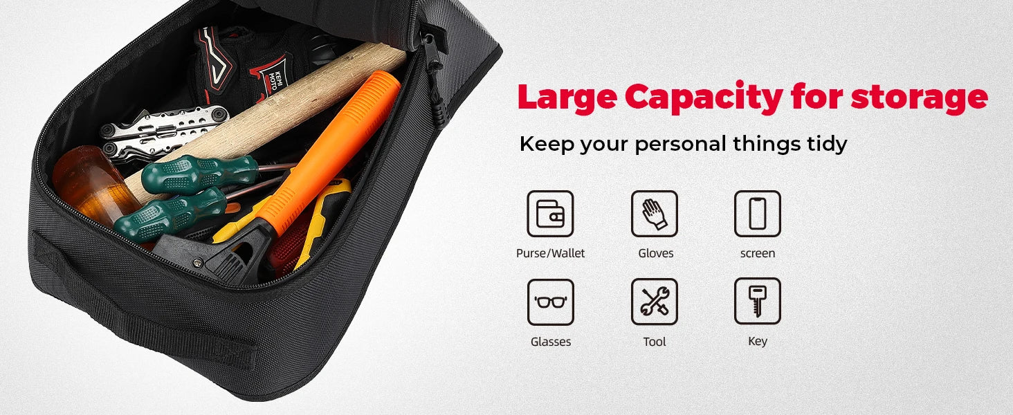 ● The bag capacity is about 2 Gal (7.5L), and there is a mesh compartment inside, which can hold gloves, maintenance tools, first aid supplies, mobile phones, earphones, keys and other personal belongings