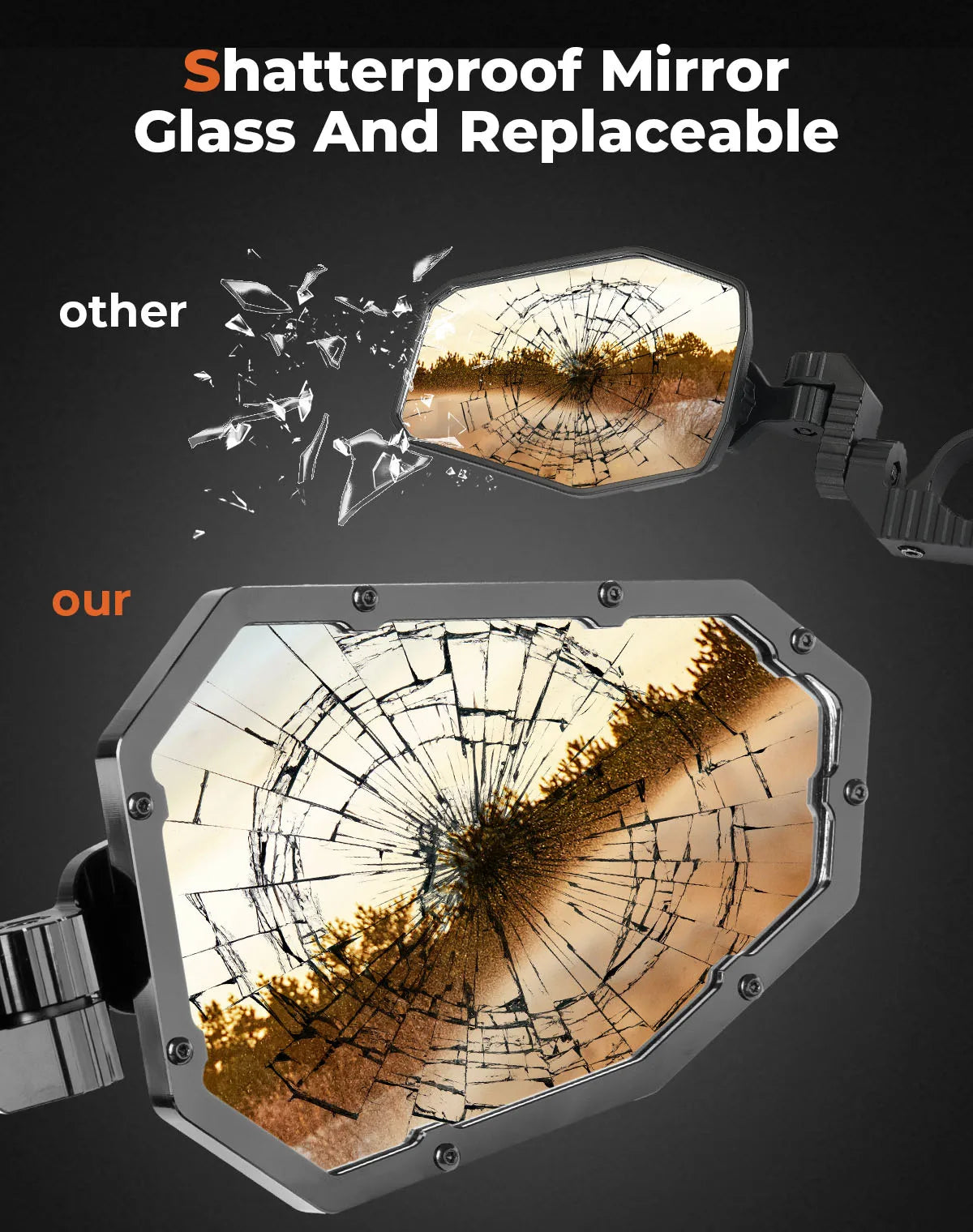 The Maverick R rear view mirrors are equipped with a folding function that allows them to retract inward when parked, preventing damage from obstacles. Additionally, the mirrors feature a shatterproof film for easy glass replacement without needing to replace the entire housing.
